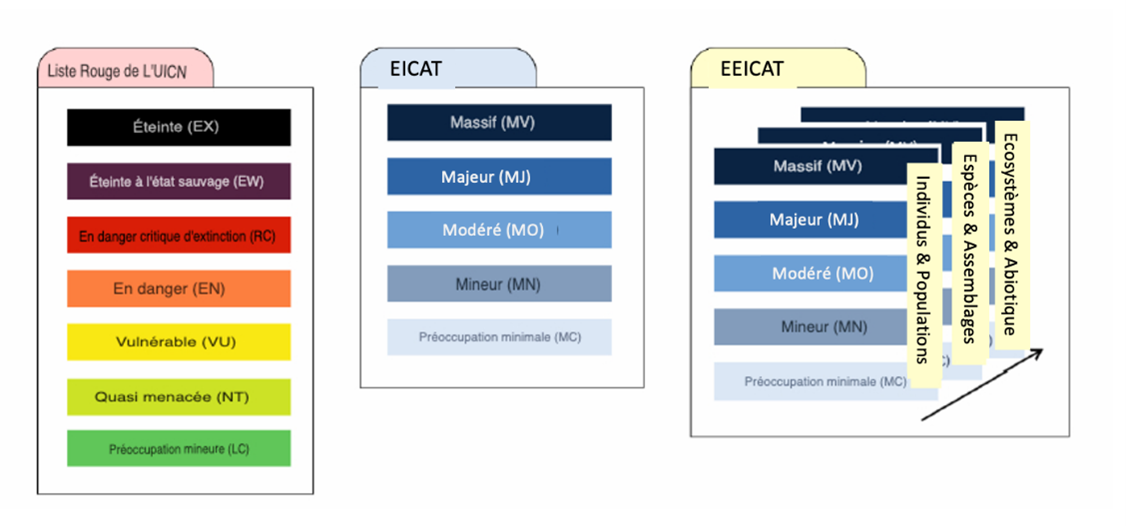 Unlike the previous system, which mainly focused on the direct effects experienced by native species (extinction or population decline), this upgrade of the framework is based on an assessment at three scales: the individual and population, the species and community, and the ecosystem and abiotic2 environment.