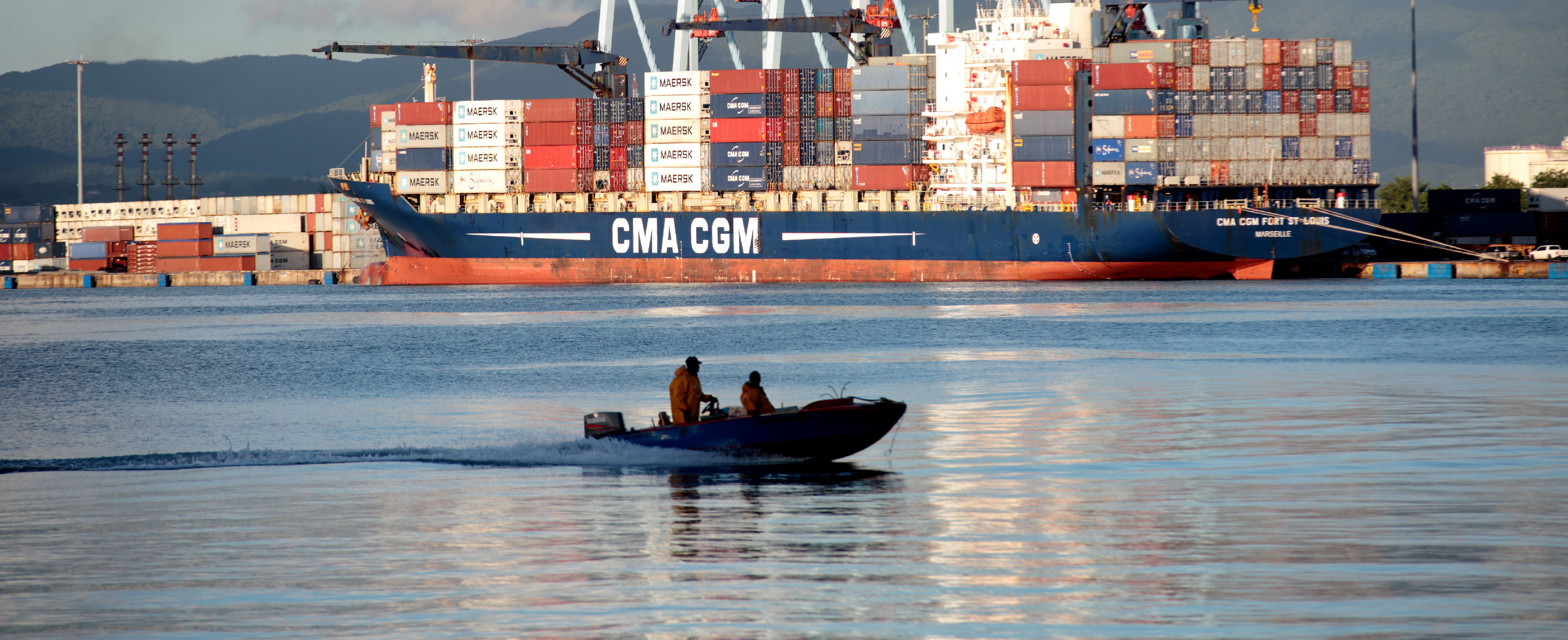Un navire de l'armateur CMA-CGM se trouve à quai dans le Grand Port Maritime de la Martinique.