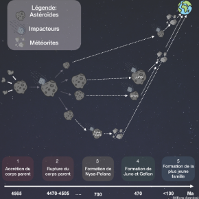 Une équipe de scientifiques du Muséum national d’Histoire naturelle, de Sorbonne Université, du CNRS, du Centre de Recherches Pétrographiques et Géochimiques de Nancy, et de l’Observatoire de la Côté d’Azur, publie une étude dans Nature Astronomy présentant le premier arbre phylogénétique des météorites les plus communes sur Terre. Il permet d’établir des liens de parenté entre les météorites, qui sont les débris des collisions astéroïdales, et les astéroïdes dont elles proviennent.